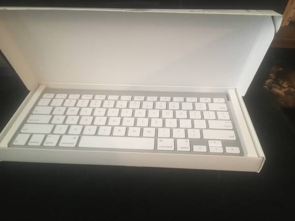 APPLE wireless keyboard (gently used). Original box included. Takes AA batteries. Bluetooth connection.